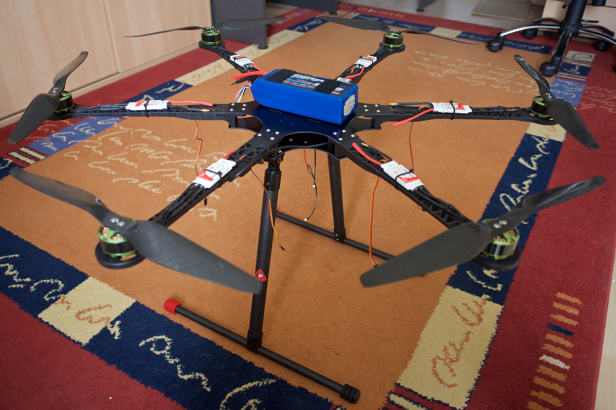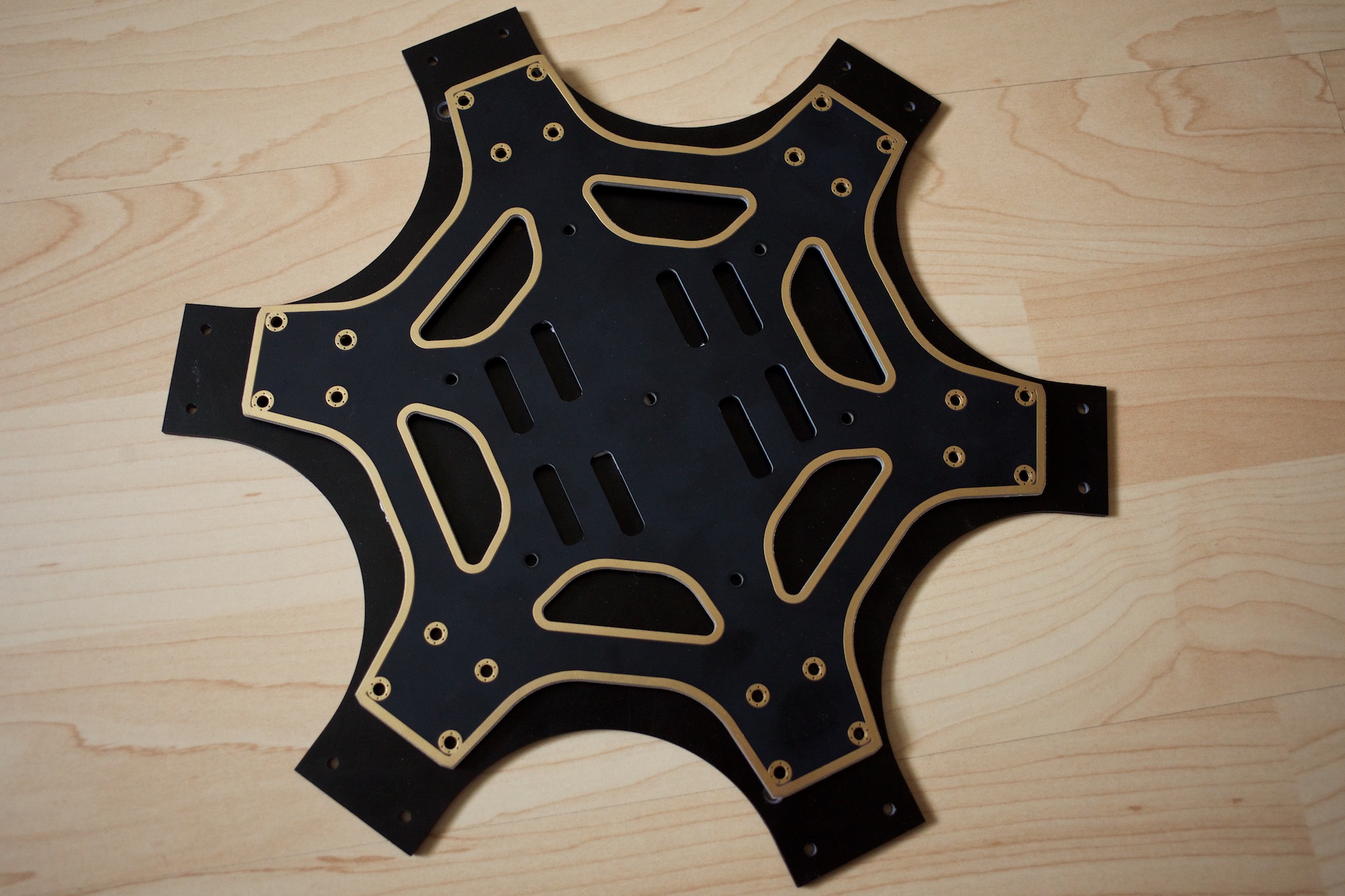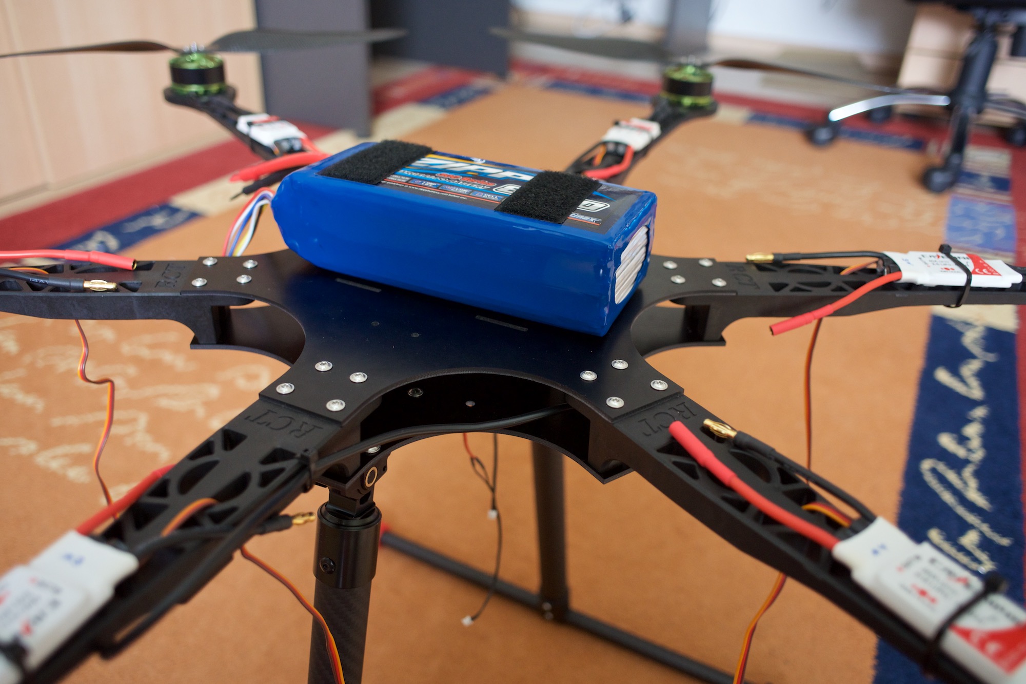 I have finally gotten around to replacing the main frames of my multicopter setup. This allows me to easily attach the newly ordered retractable landing gear I posted earlier and it has widened the aircraft in preparation for 16 inch propellers. Furthermore, I have decided to rearrange the layout. The battery pack will now be on top with the slots alongside to accommodate for velcro straps. This will allow me to quickly replace a battery pack in the field.